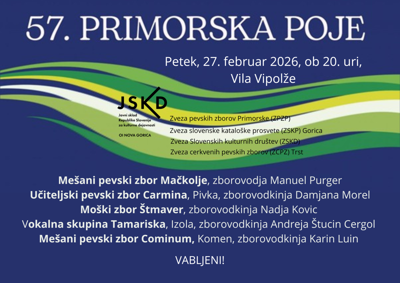 RezervirajV petek, 27. februarja 2026, ob 20. uri, vas vabimo v Vilo Vipolže na otvoritveni koncert Primorske poje. Doživite večer slovenske glasbe, kjer se prepletajo čudoviti glasovi in edinstvena energija odra. Pridružite se nam in uživajte v nepozabnem kulturnem doživetju, ki bo ...
